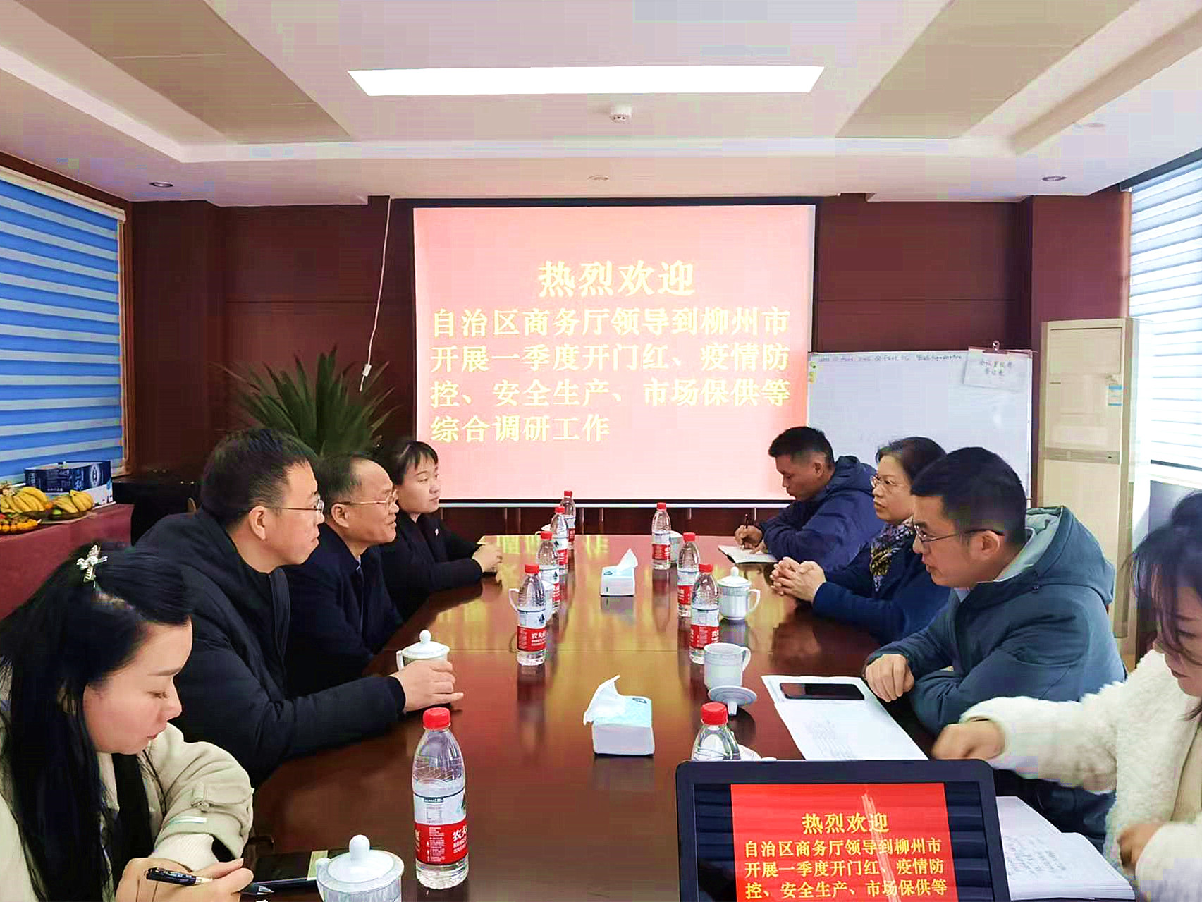 1月20日下午,自治區(qū)商務(wù)廳、柳州市商務(wù)局、柳州市魚峰區(qū)商務(wù)局等領(lǐng)導(dǎo)到訪商貿(mào)公司開展調(diào)研工作